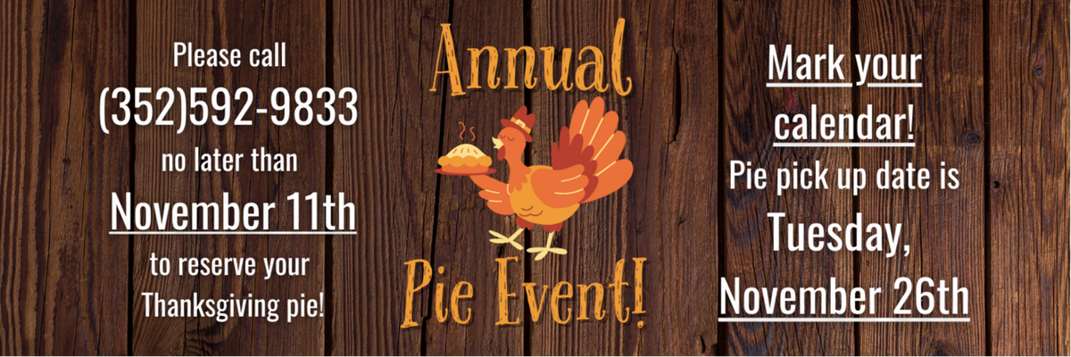 Existing clients only - please call to order your choice of cherry, home style apple, pumpkin, or wild berry (no sugar added) pie, and select your pick up timeslot.